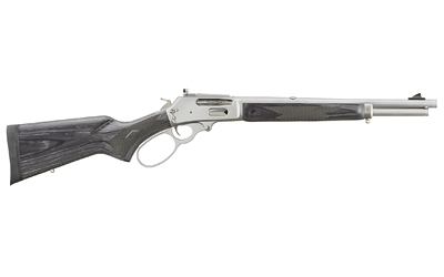 Based on the same platform as the Marlin SBL Series, the Marlin 336 Trapper boasts a shorter, more maneuverable 16″ barrel; a bead-blasted, satin stainless finish for low glare in the field and rapid acquisition with the adjustable Skinner Sights receiver-mounted peep sight system. Other features threaded barrel, with factory-installed thread protector, has a 5/8″-24 pattern; 5rd tubular magazine with a loading gate located on the receiver; soft-rubber buttpad; positive, push-button, cross-bolt manual safety and traditional half-cock hammer; laminate buttstock and forend; sharp checkering provides an excellent grip in all weather conditions; oversized lever loop; slim forend for an attractive look and comfortable feel. Includes sling swivel studs and offset hammer spur.